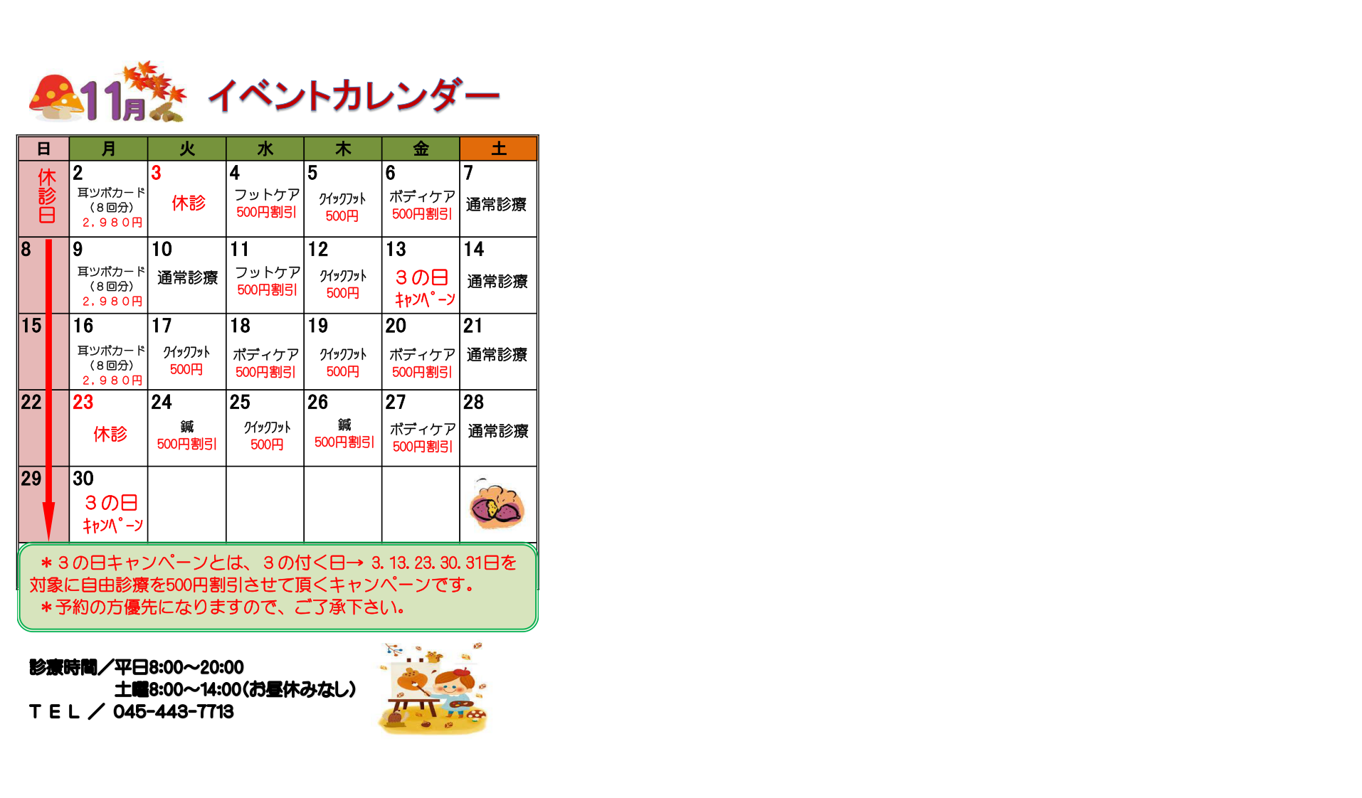 11月のイベントカレンダーになります♪ 色々と組み合わせてありますので、是非ご利用下さい!