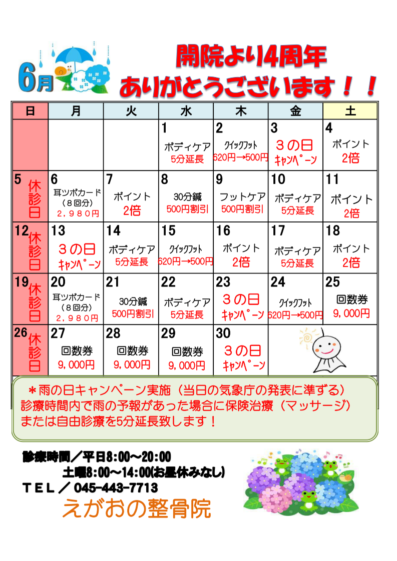 お陰様で、6月にて開院より4周年になります。 これからも患者様が、えがおになって頂ける様スタッフ一同頑張って行きたいと思います!! 6月のイベントも満載なので是非お気軽にお立ち寄り下さい